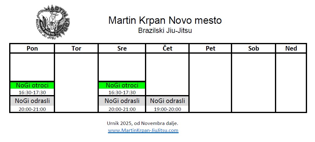 Treningi potekajo po sledečem urniku, ki prične veljati od 1.11.2025 dalje. Za boljšo ločljivost klini na urnik.